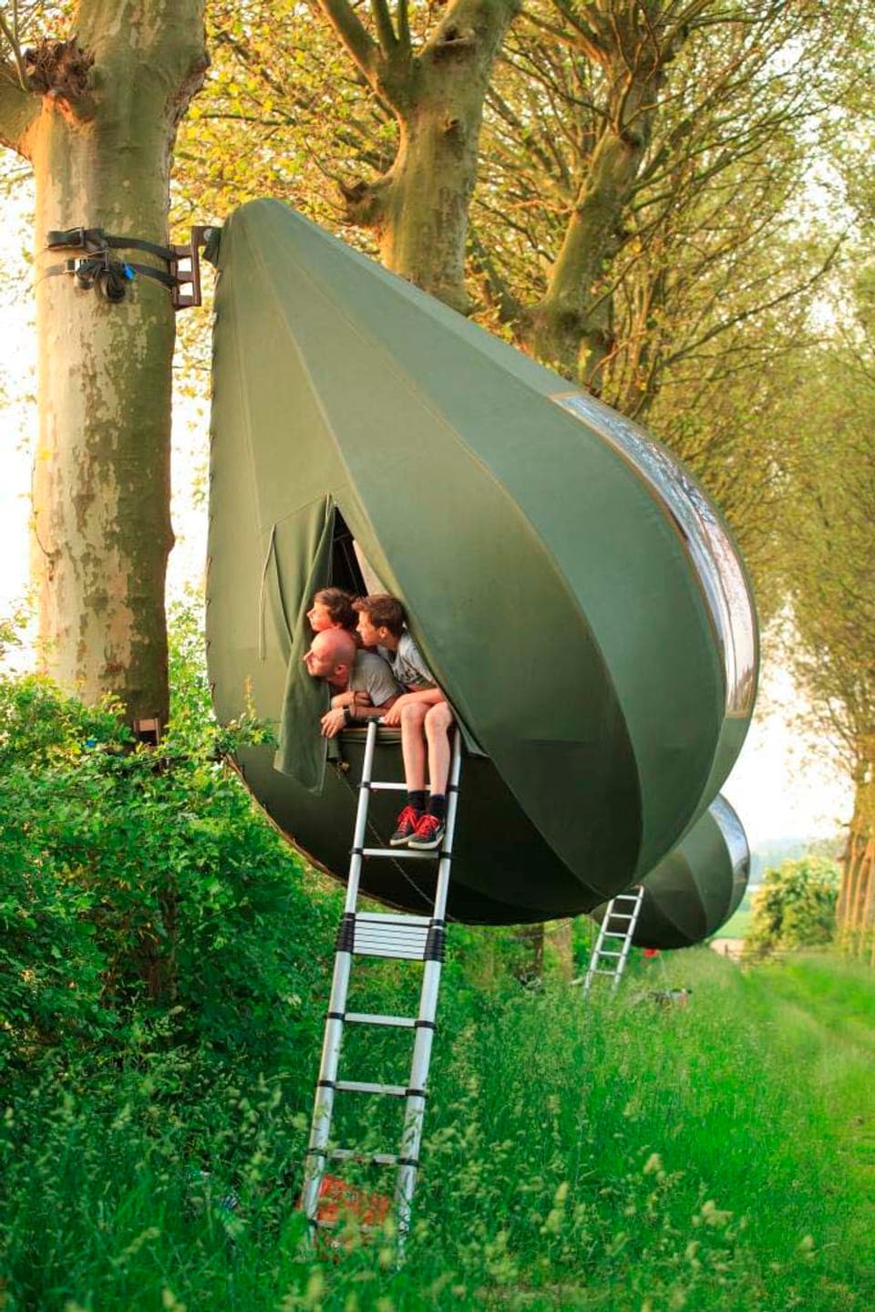 Slapen in een boomtent die lijkt op een regendruppel. Het kan middenin de natuur. Via een ladder klim je naar binnen waar een bed op je wacht. En je kunt heerlijk ontbijten in alle rust.