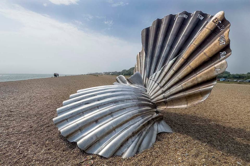 Aan de rand van het kiezelstrand staat The Scallop. Dit is een 4 meter hoge, roestvrijstalen schelpsculptuur van kunstenares Maggi Hambling, geplaatst in 2003 als eerbetoon aan componist Benjamin Britten, die in Aldeburgh woonde. In de rand staat het citaat uit zijn opera Peter Grimes: “I hear those voices that will not be drowned.” De schelp vangt het geluid van de zee op en fungeert daardoor als een soort klanksculptuur. Ze staat rechtstreeks op het kiezelstrand en is uitgegroeid tot een herkenningspunt en populaire fotolocatie, vooral bij zonsopkomst of zonsondergang.