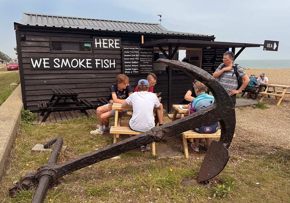 Langs de kust zie je meerdere kramen waar je vers gevangen vis uit de Noordzee kunt kopen. Gerookte vis is een specialiteit van de regio, de vis wordt nog traditioneel boven eikenhout bereid. Ook kun je diverse soorten cakes krijgen met vis, ik heb er diverse geprobeerd Ik vond het heerlijk. Bijna alle kramen krijgen goede reviews van de Engelsen. Je kunt ter plekke de vis zien en het menu bekijken. De viskraam Aldeburgh Fish & Chips is beroemd in heel Engeland. Je kunt voor lunch gaan en dan in de rij gaan staan, ik ging op een ongewone tijden (bijvoorbeeld rond 15:00 uur) en werd direct geholpen. Het aanbod varieert per seizoen en dagvangst, maar vaak vind je: