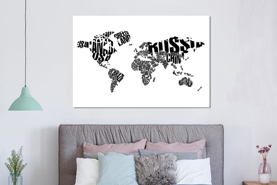 Een van de meest creatieve wereldkaarten voor aan je muur is deze. De landen zijn vervangen door de namen ervan, waardoor je meteen ziet hoe groot een land ongeveer is.