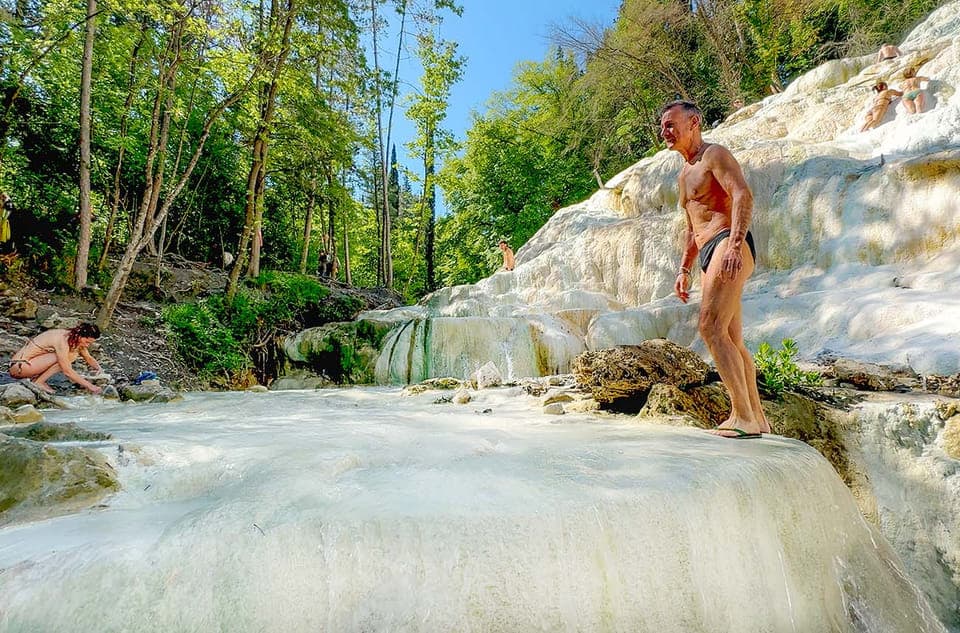 Op mijn route naar Mugello maak ik een stop bij Bagni San Filippo. Deze gratis heetwaterbron is gelegen aan de oostelijke hellingen van de Monte Amiata. Het meest opvallende kenmerk van Bagni San Filippo is de Fosso Bianco, een reeks natuurlijke thermale baden en watervallen omgeven door weelderige bossen. Hier vind je de beroemde "Balena Bianca" (Witte Walvis). Dit is een indrukwekkende witte kalksteenformatie gevormd door de afzetting van calciumcarbonaat uit het warme, mineraalrijke water. Het water stroomt uit de bron met een temperatuur van ongeveer 48°C en mengt zich met het koude rivierwater, wat resulteert in een opvallende wit-blauwe kleur die prachtig contrasteert met het omliggende groen. De baden zijn gratis, parkeren kost wel een paar euro. Ik ga bewust vroeg in de ochtend, zodat het nog niet te druk is.