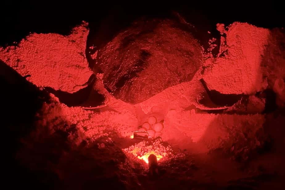 Op het strand wacht je in stilte. Geen licht, geen geluid. Als een vrouwtje eenmaal begint met nestelen mag je langzaam dichterbij. Je ziet hoe ze met haar achterpoten een nest van vijftig tot zeventig centimeter diep graaft, hoe ze tachtig tot honderd twintig eieren legt, en hoe ze het nest daarna zorgvuldig afdekt. Daarna verdwijnt ze weer in de oceaan, alsof ze er nooit is geweest. Let wel: het hele proces duurt zo'n dertig tot vijftig minuten.