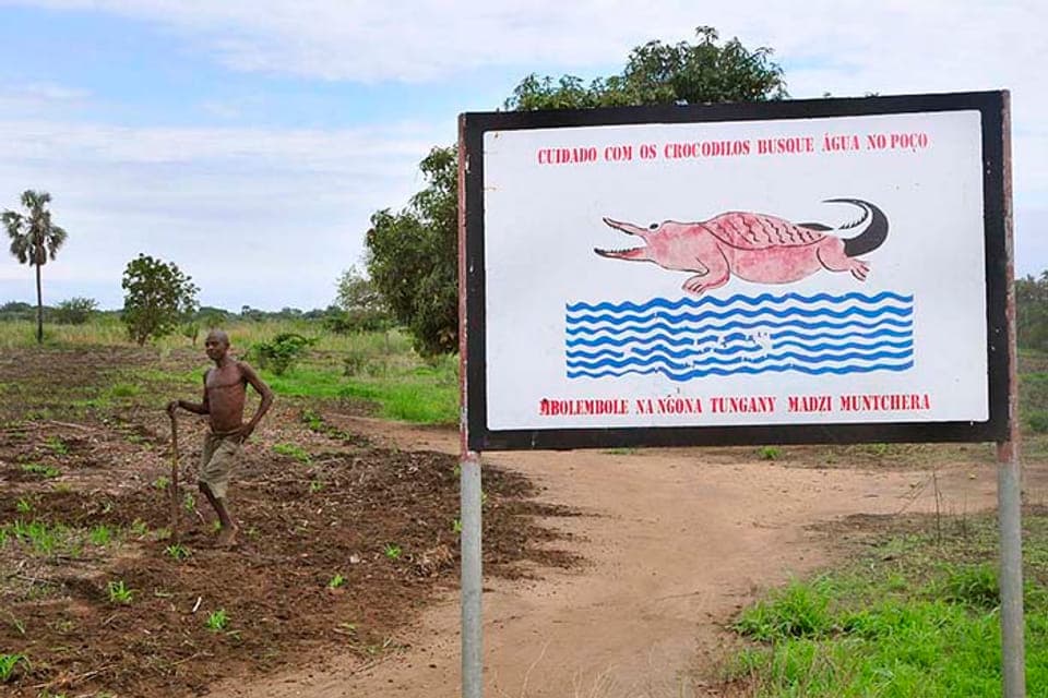 Het piepkleine bootje brengt mensen naar het dorpje aan de overkant. En niet zonder reden. Twee vrouwen zijn hier de afgelopen maanden nog gedood door nijlkrokodillen. Het bord bij het water waarschuwt overduidelijk de lokale bevolking voor de gevaren, maar ik zie toch nog een man op zijn gemak de rivier door waden.