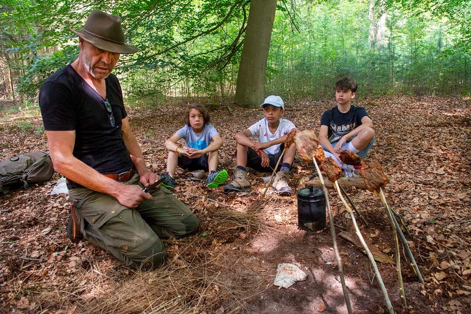 Martin geeft me oerspek, wat ik boven het vuur mag verwarmen. ,,We kunnen ook gaan vissen, dan kun je het echt zelf doen." Hij gaat zitten en geniet van de omgeving. Een paar vogels fluiten, een minuut later doet de theepot mee. Zo heb ik de natuur in Nederland nog niet beleefd.
