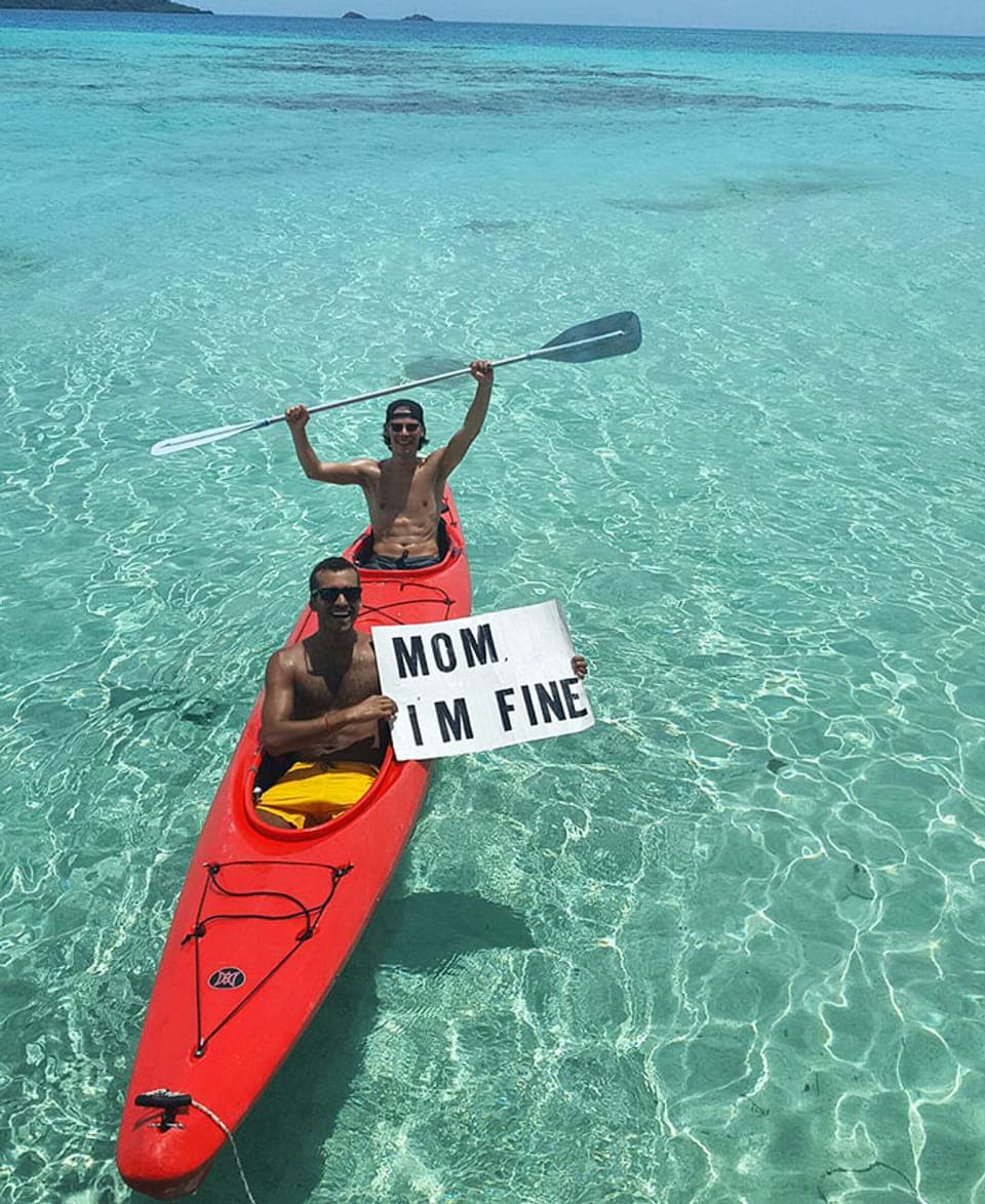 Op elke foto zet hij de tekst: ‘Mom, I’m fine’ (moeder, het gaat goed). En dat levert een hele leuke fotoserie op. Want hij maakt ook grappige foto's.