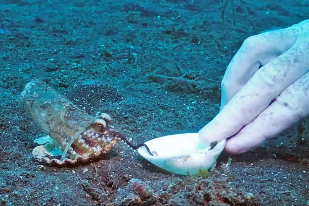 Hij zoekt naar passende schelpen die het dier als huis kan gebruiken om zich te beschermen tegen bijvoorbeeld roofvissen. Maar het dier is niet eenvoudig over te halen. De duikers raken door hun zuurstof heen, maar hebben uiteindelijk toch succes. Eind goed, al goed. De octopus heeft een nieuw huis en de duikers ruimen het plastic op.