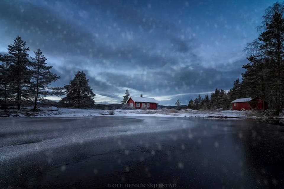 Wie naar Noorwegen is geweest herkent het vast. Ole Henrik maakt elke keer een foto van zijn reis waarop het rode huisje te zien is.