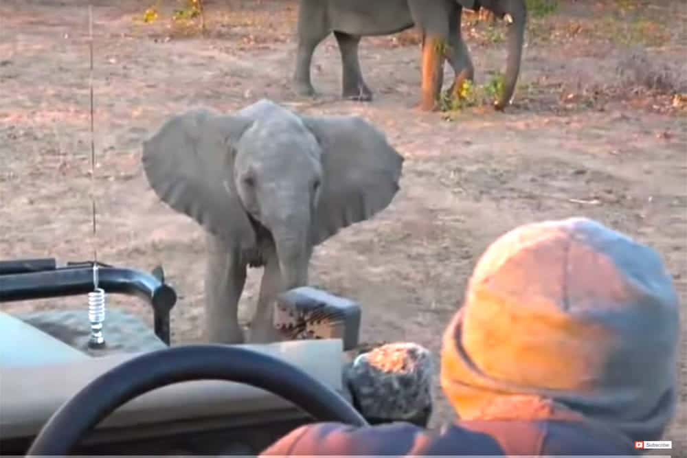 Een jong met veel bravoure wil laten zien dat hij niet bang is en komt heel dichtbij de jeep. En laat duidelijk merken niet onder de indruk te zijn van de veel grotere jeep. Hij gooit zijn oren wijd en wappert met zijn mini-slurf.