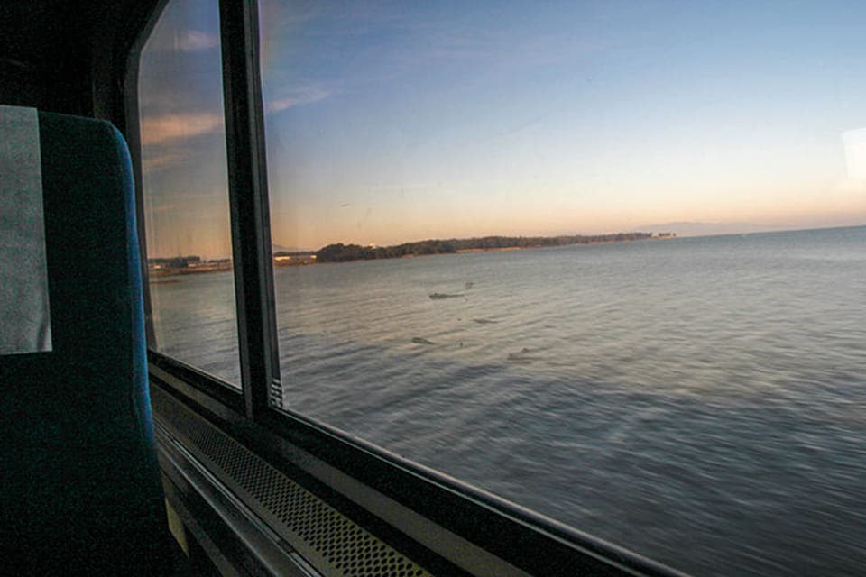 Derek begon zijn reis in San Francisco. En door de San Francisco Bay Area reed de trein bijna over water. Daarna ging het snel het binnenland in en rukte de bomen op. Meer en meer bossen en meer en meer rotsen.