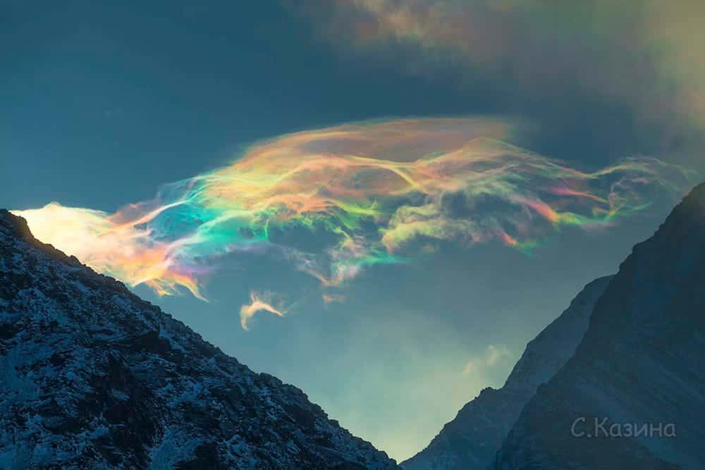 Recent zag ze iets bijzonders. Ze reisde naar de hoogste bergen van Siberië, in de bij ons onbekende berg Belukha. Waar ze een bizar wolkenveld zag. Het zijn iriserende wolken, die worden veroorzaakt door kleine waterdruppels of ijskristallen die het binnenvallende licht verstrooien. Waardoor je allerlei kleuren kunt zien in de lucht. Van groen, rood, geel, oranje en blauw. Het is een fenomeen dat zelden wordt gespot.