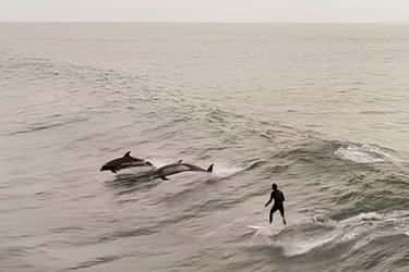 Dit is een indrukwekkende video van een walvis die een groepje surfers bezoekt. Het dier zwemt op zijn gemak onder de surfers door die zitten te wachten op een grote golf. De meest surfers hebben het niet eens door, sommigen wel. Die zijn verbaasd om dat grote dier onder hun te zien.