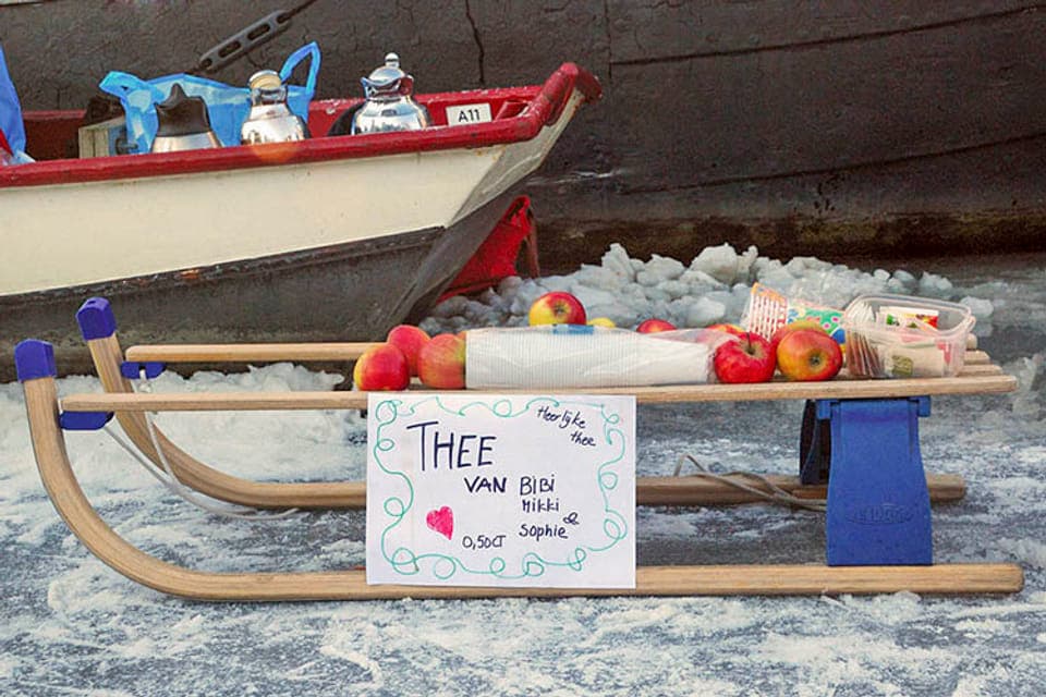 Kinderen doen hun eerste pogingen op het ijs. Her en der zijn spontaan kraampjes ontstaan. Al is kraampjes misschien wat overdreven. Ik zie wat borden met Koek en Zopie en een drankje. Dat wordt ingeschonken door twee kinderen.