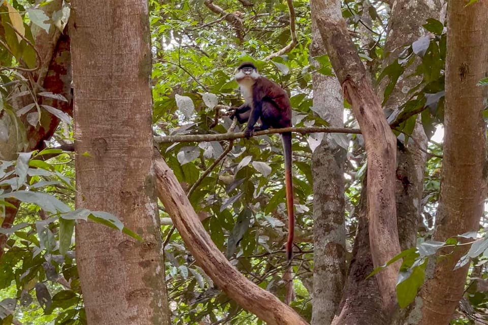 De Bigodi Wetland Sanctuary, gelegen aan de rand van het park, biedt een unieke kans om de moerasvegetatie te verkennen. Deze wandelingen lopen gedeeltelijk over houten vlonders. Het gebied is bijzonder rijk aan vogels en kleinere primaten, merkte ik toen ik er rond liep met een lokale gids. En ook nu weer zag ik diverse soorten apen.