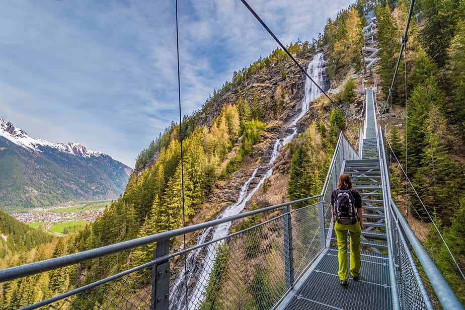 Het absolute hoogtepunt is de hangbrug. Hier steek je de waterval over, met het kolkende water onder je. Even later klim je verder, met telkens nieuwe uitzichten. Er zijn 6 uitkijkpunten, de bovenste is de meest intrigerende. Om daar te komen moet je de waterval overlopen via een brug. Juist die afwisseling maakt dit een van de mooiste wandelingen in het Ötztal.