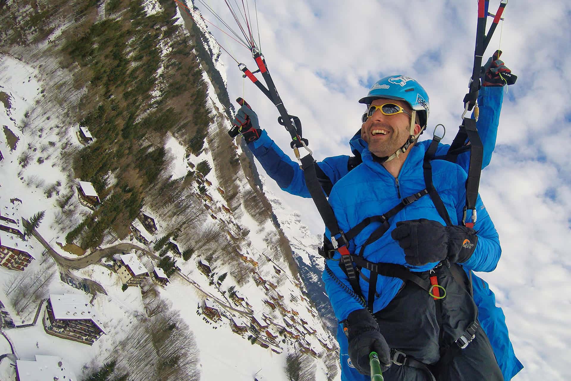 De zon hangt laag, de sneeuw krijgt een zachte rode gloed. Ik word gekleineerd door de Alpen om me heen. Op een hoogte van meer dan 2000 meter glijden we de berg af, totdat de parapente ons omhoog trekt.