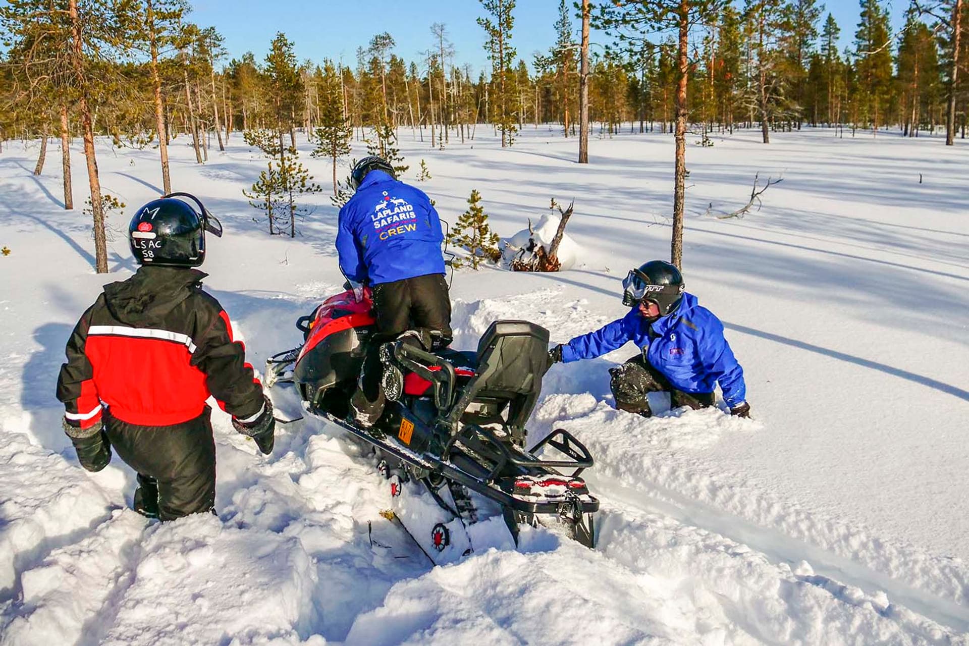 Het pad wordt breder en ik kan ineens ver kijken. Een groepje toeristen komt voorbij. Plots is er een vreemd geluid. Een sneeuwscooter zakt weg in de zachte sneeuw. En langzaam kantelt het voertuig.