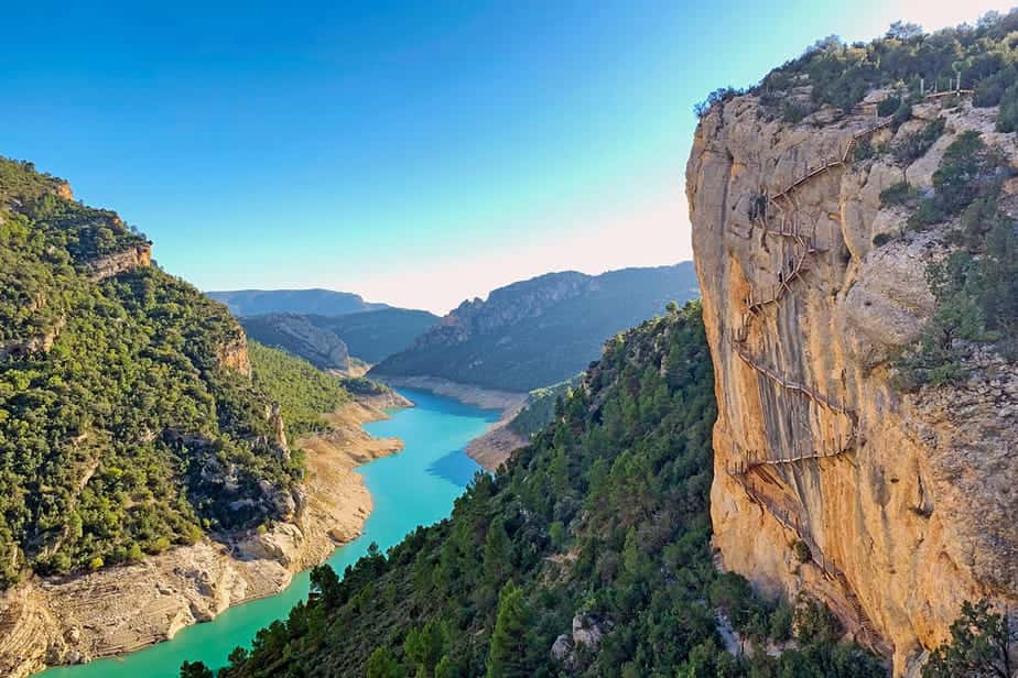 De Pasarelas de Montfalcó behoren tot de spectaculairste wandelroutes van Spanje. Smalle houten loopbruggen, vastgeklonken tegen loodrechte rotswanden, leiden je door de indrukwekkende Congost de Mont-rebei, een diepe kloof op de grens van Aragón en Catalonië. Hier wandel je letterlijk boven het turquoise water van de rivier de Noguera Ribagorçana, met uitzicht op steile kliffen en ruige natuur. Wie houdt van avontuur, hoogte en ongerepte landschappen, mag deze plek niet missen. Dit zijn de beste tips om Pasarelas de Montfalcó te bezoeken.