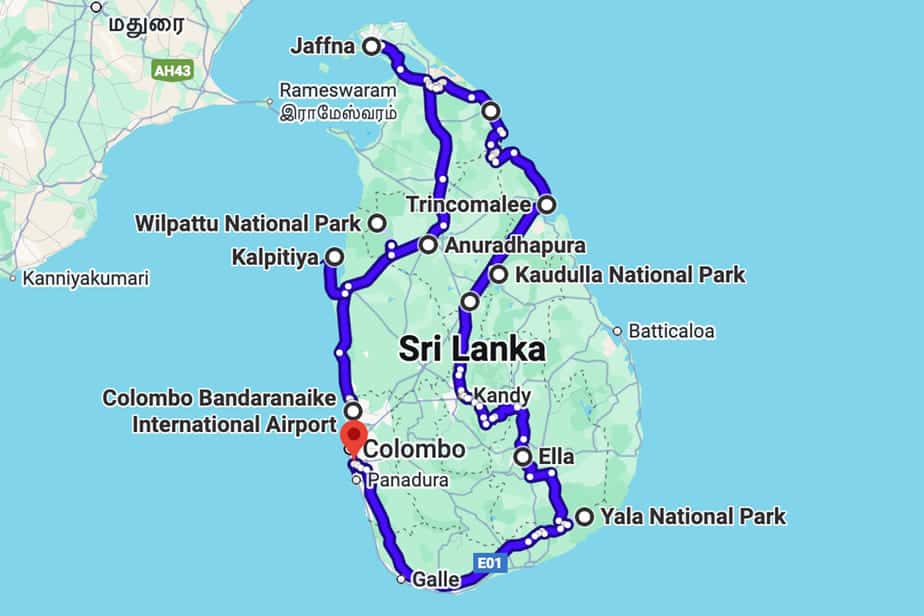 Ik heb er bewust voor gekozen om een aantal extreem drukke plekken te vermijden of kort te houden, en in plaats daarvan alternatieven op te nemen die rustiger en vaak indrukwekkender zijn. Deze reis draait niet om zoveel mogelijk zien, maar om de diversiteit van Sri Lanka echt te voelen. Denk daarbij aan de Tamil-cultuur in het noorden tot mistige bergpaden, van safari’s tot lange strandwandelingen. Onderstaande reisroute is bedoeld als inspiratie en voorbeeldreis voor wie Sri Lanka in de volle breedte wil ontdekken.