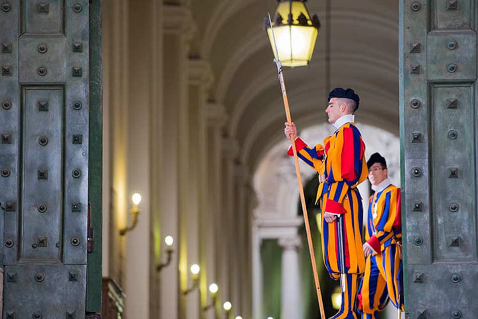 De Zwitserse Garde werd in de middeleeuwen opgericht in Vaticaanstad om koningen te beschermen. Een lid van de Zwitserse Garde wordt aangeworven door de Paus. Je kunt een lid van de Zwitserse Garde nog steeds zien.
