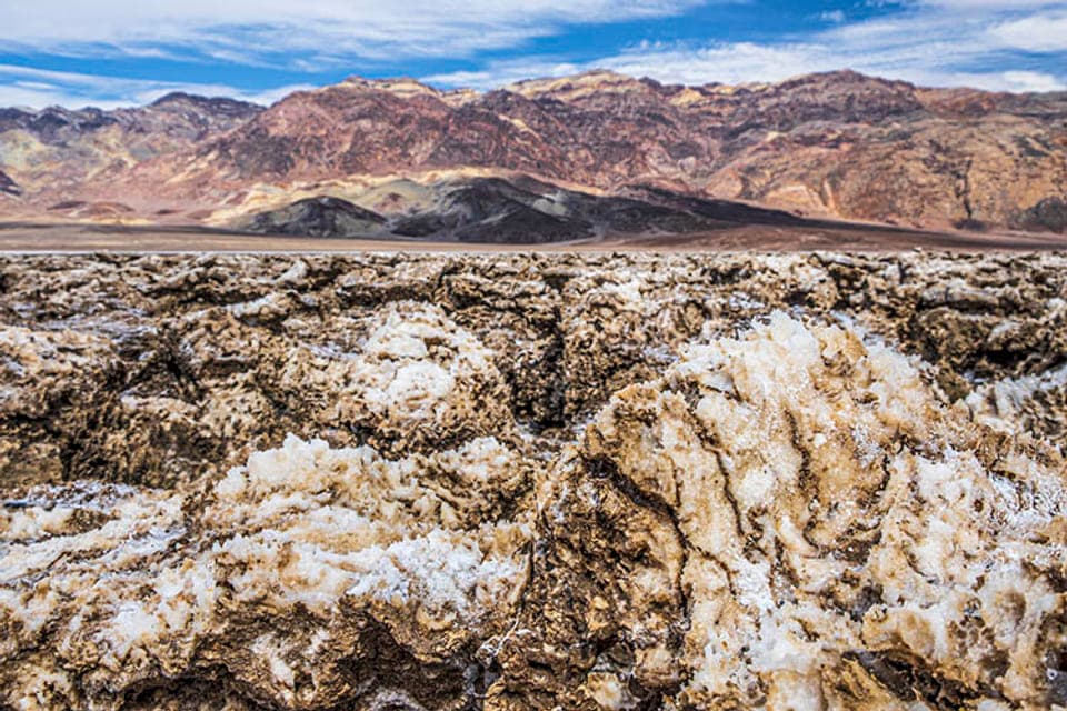 De Devil’s Golf Course is een enorm veld vol met vreemd gevormde zoutkristallen. Deze kristallen zijn door wind en regen geboetseerd. En de laag met kristallen is meer dan 300 meter diep, zo bleek uit geologisch onderzoek. Je kunt er niet over lopen, waardoor je een ‘duivel’ moet zijn om hier te kunnen golfen. De eenrichtingsweg ligt aan de Badwater Road.