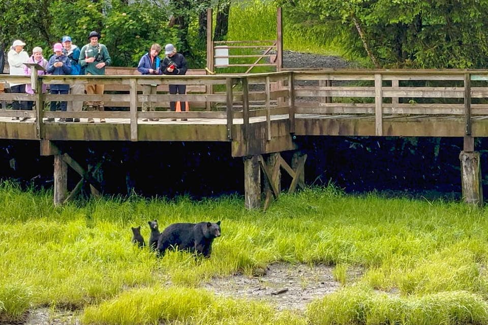 Herring Cove is een beroemde baai in Alaska waar je relatief eenvoudig zwarte beren kunt zien als ze jagen op zalm. De baai ligt ongeveer 12 kilometer ten zuiden van het centrum van het plaatsje Ketchikan. Je kunt er zelf heen, maar ook met een excursie met gids. Ik kwam een moederbeer met twee jongen tegen, die probeerde een zalm te stelen van een groep zeearenden.