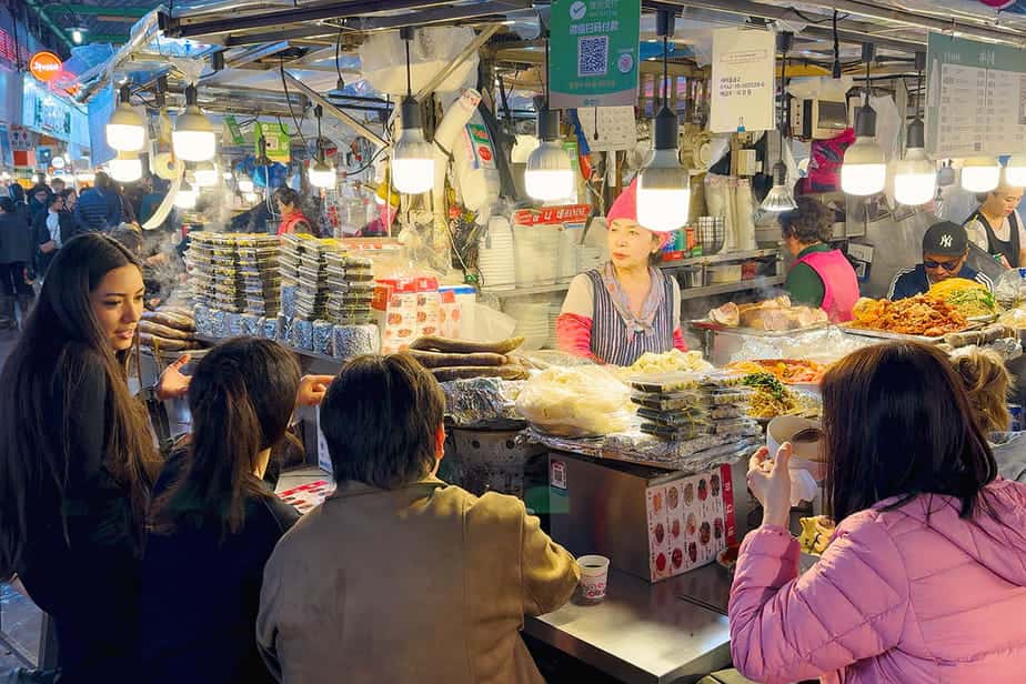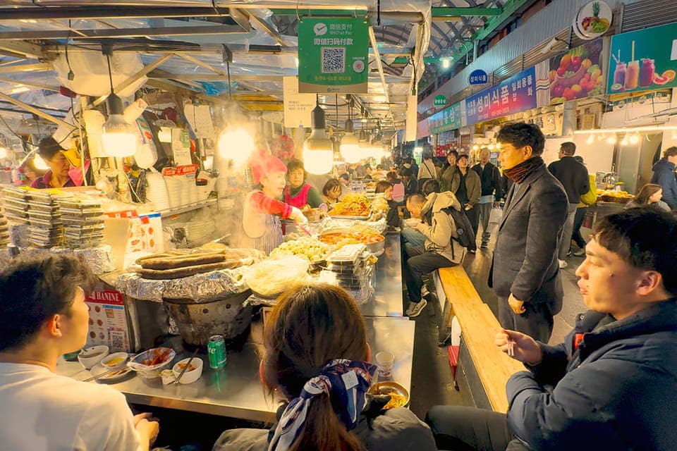 Gwangjang Market is de oudste foodmarkt van Seoul, maar ook de meest toeristische. Het is een plek waar je meteen wordt ondergedompeld in het traditionele eetleven van Korea. Ik ging hierheen toen ik net was aangekomen voor een eerste kennismaking. Tussen de lange rijen kraampjes bereiden vrouwen al generaties lang dezelfde gerechten: knapperige bindaetteok (hartige Koreaanse pannenkoek gemaakt van gemalen mungbonen, vaak verrijkt met ingrediënten zoals varkensvlees, kimchi, taugé en lente-ui), minirolletjes mayak kimbap (soort Koreaanse sushi) en diepe kommen kalguksu (Koreaans noedelgerecht dat bestaat uit handgemaakte tarwenoedels, geserveerd in een warme, hartige bouillon met diverse groente). Ook vind je er diverse soorten gefrituurde kip en nog veel meer. Ik vond het een van de meest pure eetervaringen van de stad; de sfeer is rumoerig, warm en onveranderd door de tijd. Hier eet je schouder aan schouder met locals, wat Gwangjang een heerlijke plek maakt om de échte smaak van Korea te ontdekken. Je kunt hier zonder problemen alles eten, de kans dat je er ziek van wordt is erg klein. Hou er wel rekening mee dat sommige gerechten rauw of met ingewanden zijn.