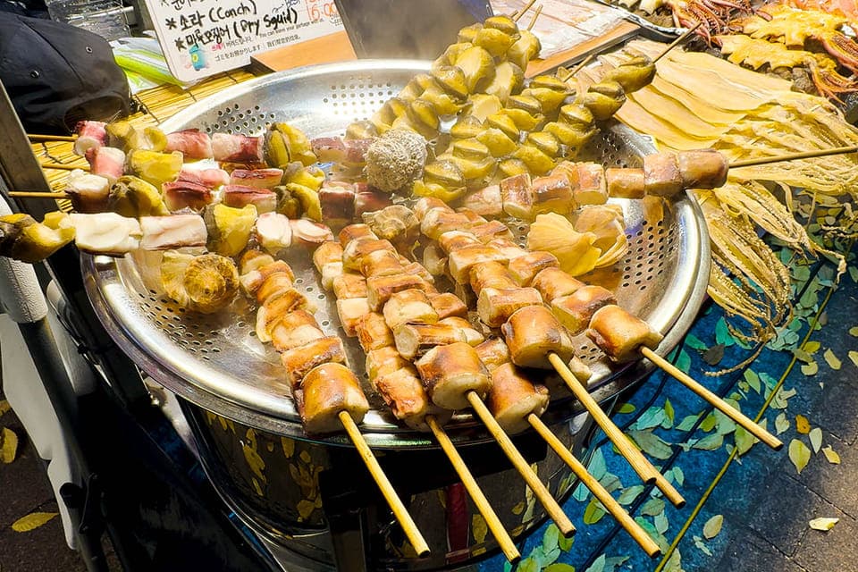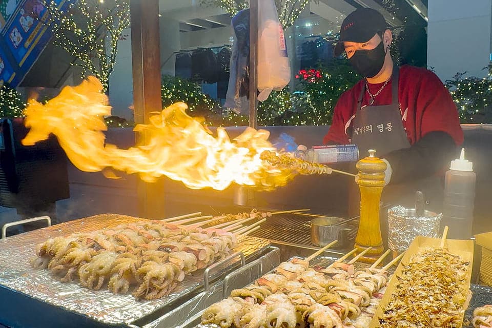 Aan de andere kant van het spectrum staat Myeongdong Street Food, waar het moderne Seoul zich in volle glorie laat zien. Zodra de avond valt, verandert de wijk in een felgekleurde droom van neon en geuren. Ik slenterde tussen de kramen met hoe (rauwe vis, zoals sashimi), gegrilde garnalen, kaasgevulde aardappels, hotteok (zoete Koreaanse streetfood-pannenkoek, gemaakt van gistdeeg gevuld met een smeuïge mix van bruine suiker, kaneel en noten als pinda's), tako-yaki (Japanse snack in de vorm van kleine ronde balletjes met stukjes octopus erin), corn dogs (Koreaanse hotdog met een beslag van tarwemeel met gist. Er zijn allerlei soorten: met aardappel, kaas, fish cakes of rice cakes) en zelfs gegratineerde lobster rolls. De energie is aanstekelijk en iedere kraam lijkt iets te hebben dat je nog nooit eerder hebt geproefd. Myeongdong is een speeltuin voor foodies: creatief, verrassend en altijd in beweging.