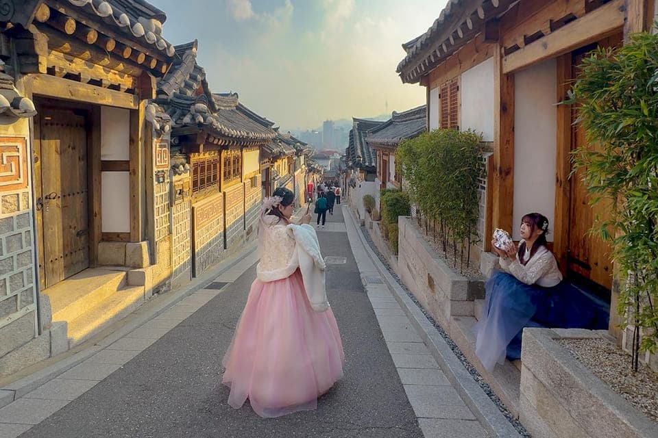 Bukchon Hanok Village is een wijk waar je langzaam doorheen moet wandelen. De oude hanok-huizen, houten poorten en smalle steegjes geven het gevoel dat je tientallen jaren terug in de tijd stapt. Vooral in de vroege ochtend hing er een stille sfeer, met alleen het zachte geluid van bezems en voetstappen. In Samcheong-dong iets verderop vind je moderne kunstgalerieën en kleine koffiezaken die perfect passen bij de traditionele omgeving. Ook hier lopen sommige mensen in hanbok, maar wel veel minder dan bij het paleis.